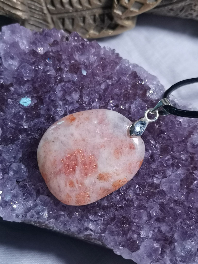 Magnifique pendentif pierre plate, en Pierre du soleil pour rayonner et laisser exploser sa joie. Chakra du Plexus solaire. Dimension 2,5 x 2,5 cm Cordon coulissant en fil ciré noir
